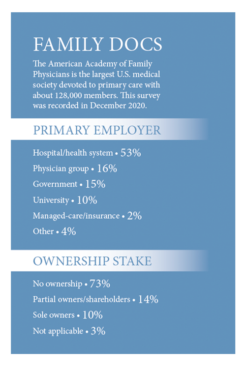 In 2021, the American Medical Association says more doctors were employed by large health care organizations, including private-equity firms, than practiced independently. The AMA says the split is 51% vs 48%, though some experts say corporate ownership is actually much higher.