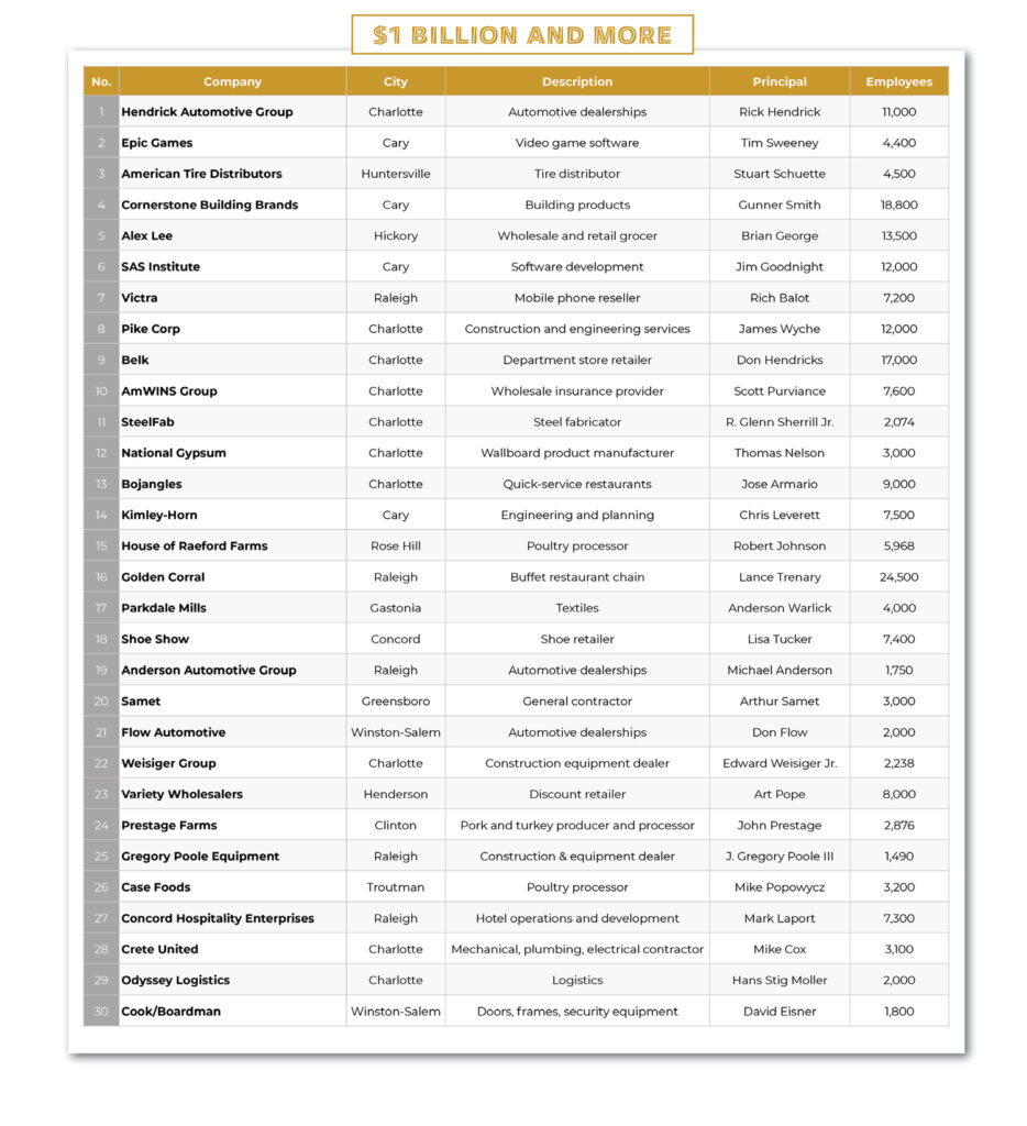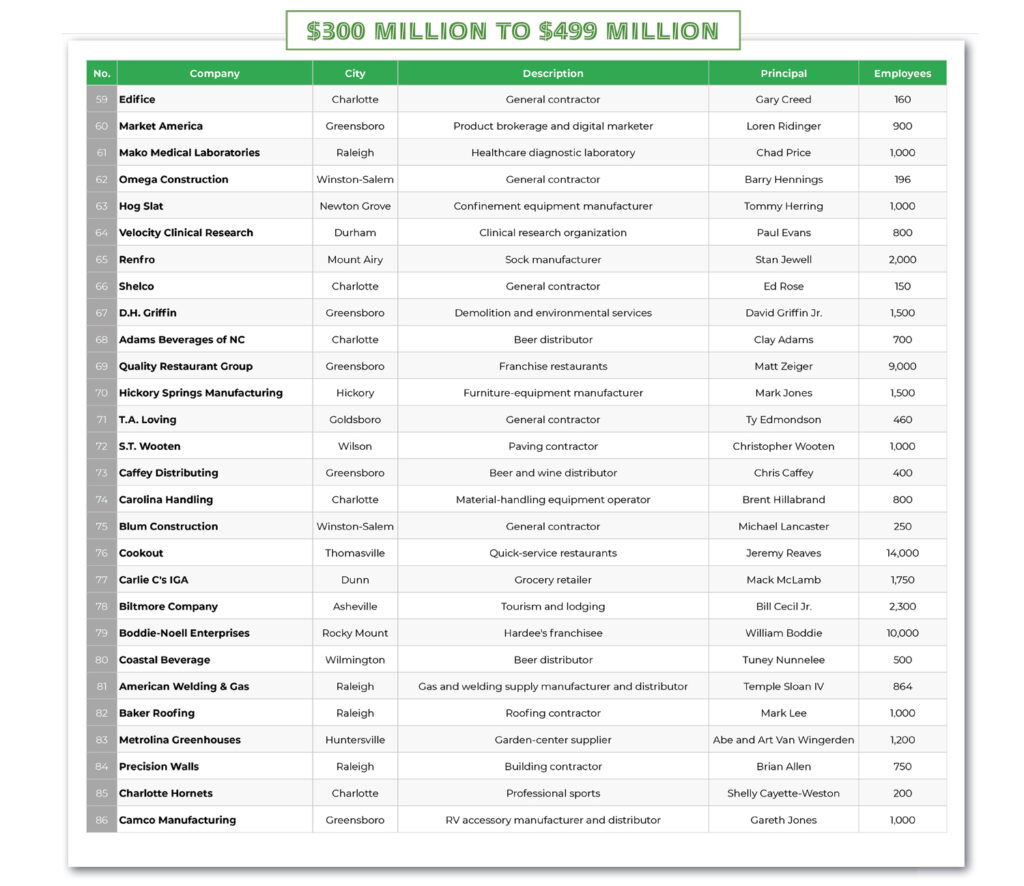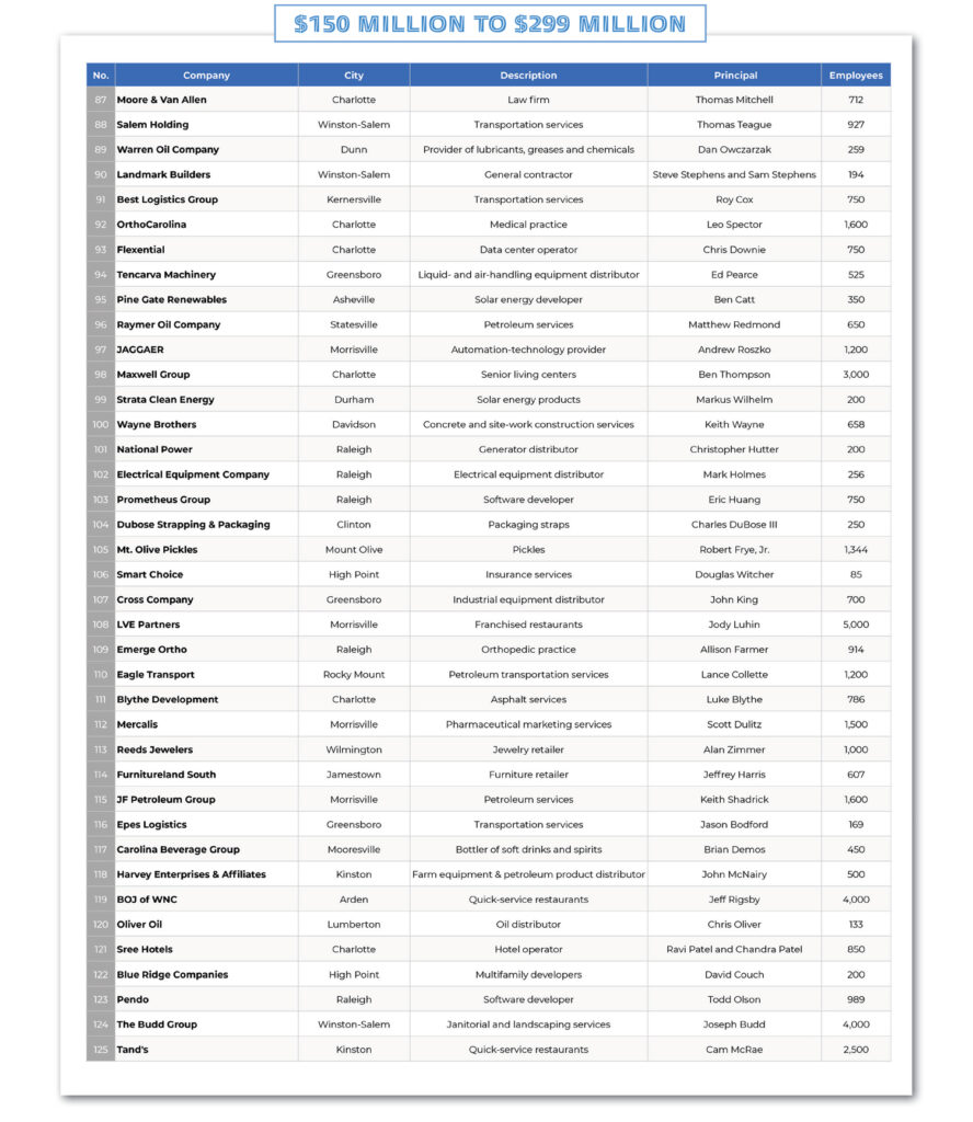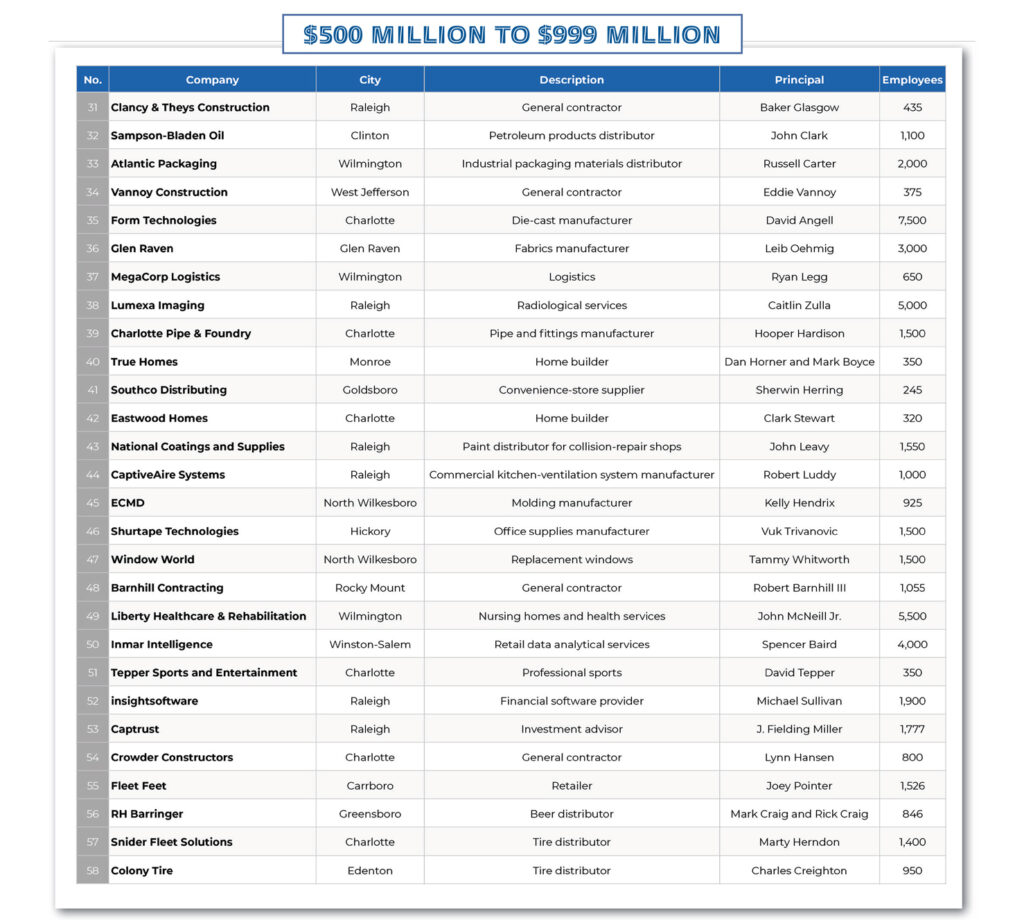 Newcomers this year include building products distributor Cornerstone Building Brands of Cary; construction services contractor Crete United of Charlotte; transportation broker Odyssey Logistics of Charlotte; and medical services provider Lumexa Imaging of Raleigh.