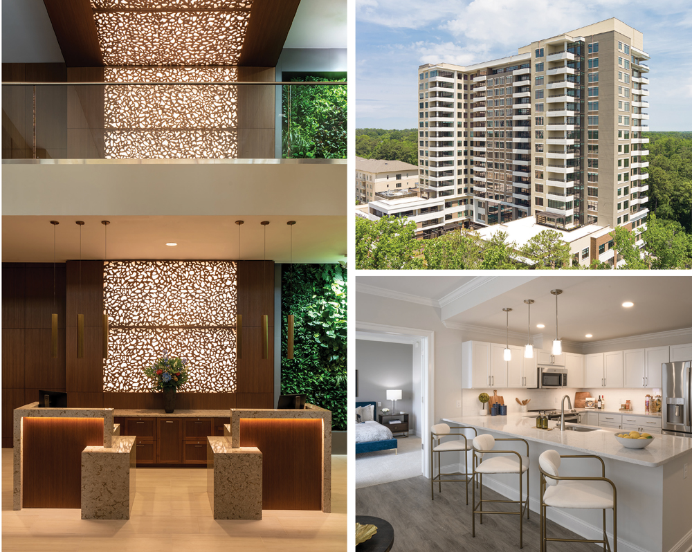Natural finishes and materials, including a two-story living green wall in the lobby, emphasize access to the outdoors. Amenities include chef-prepared meals in multiple dining venues, two fitness centers, beauty salon and an indoor saltwater pool. The veranda of the 35,000-square-foot clubhouse overlooks the courtyard and garden.