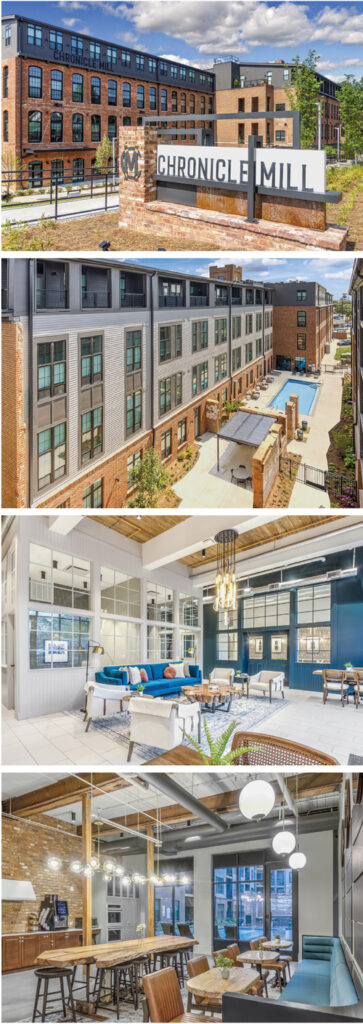 Chronicle Mill opened in 1901, becoming Belmontโs first textile mill. By the 1930s, more than 20 mills followed, spiraling Belmontโs population from 145 at the turn of the century to more than 4,000. Chronicle Mill produced its last skein of yarn in 2010 after operating for more than a century. In 2013, John and Jennnifer Church, who own Centra Properties, bought the shuttered mill and would partner six years later with Armada Hoffler. Today, the Chronicle Mill has been reborn near downtown into one- and two-bedroom loft apartments with exposed brick walls, original maple hardwood ceilings and timber beams. The first tenants arrived in October 2022. Rent ranges from $1,300 for a 460-square-foot studio to more than $3,500 with lots of price points in between. There is also 9,000 square feet of commercial space and the Mill Collective, a public coworking space.