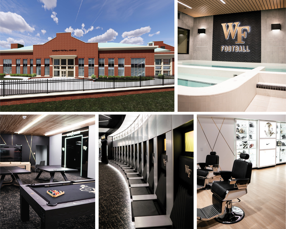Wake Forest University has among the smallest enrollments of any member of a Power 5 athletic conference, but it wants to be a strong competitor. Over the past eight years, it has spent more than $100 million on its football facilities. The latest piece, the McCreary Football Complex, includes locker space for 130 student-athletes, a dining area for as many as 200 people, athletic training and equipment rooms. Extras include hot or cold plunge pool areas, billiards and ping pong tables and a barber shop.