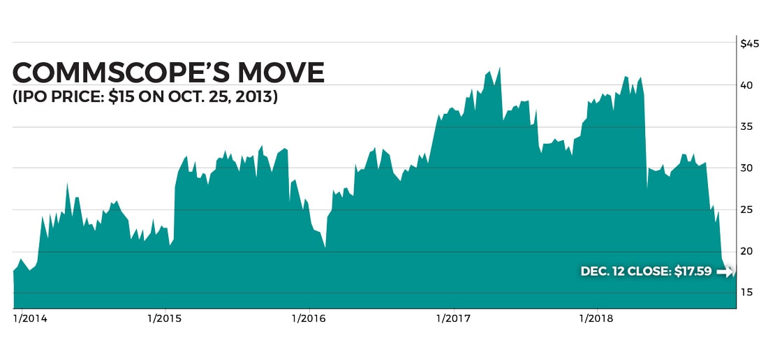 At about $17.75 in mid-December, CommScope trades near its $15 initial public offering price in 2013 and was down from a peak of more than $42 in 2017.