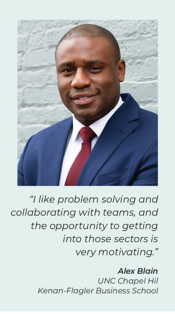 Blain already has plenty of professional experience in his current role in the inspector general’s office at the Pentagon and in Kenan-Flagler’s STAR program (Student Teams Achieving Results), which matches business students with corporate partners to help them solve problems and challenges.