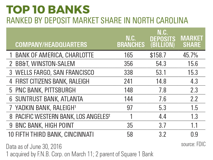 The banking leaderboard in North Carolina reads like a who’s who of national financial institutions: Bank of America, BB&T, First Citizens Bank & Trust and Wells Fargo, which have deep roots in the state.