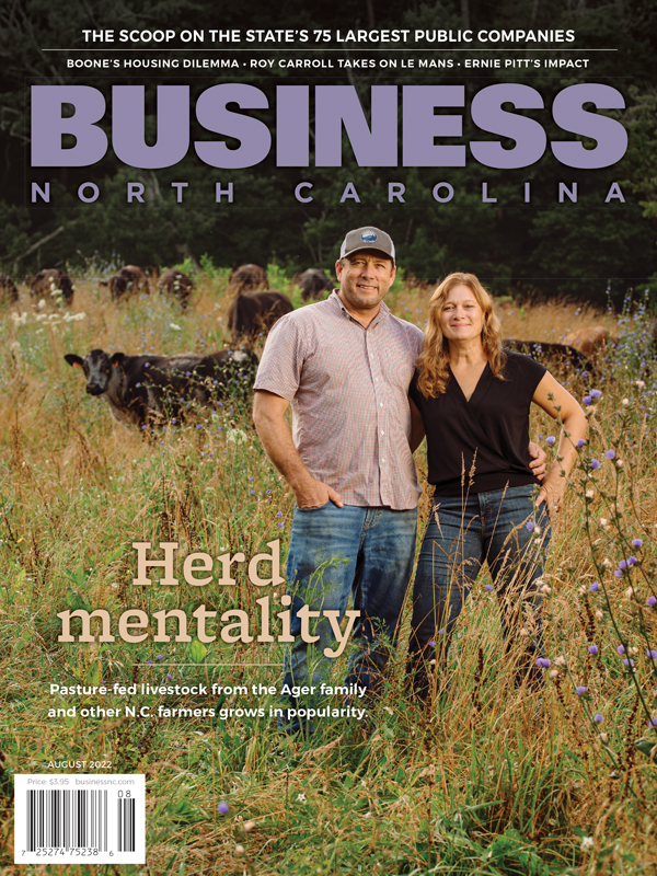 The August Business North Carolina magazine offers a mix of stocks, livestock and stories of entrepreneurship. The annual ranking of the 75 largest companies based in the state shows sharp declines in market value over the past year. Ed Martin’s cover story describes how small cattle and hog farms are making big gains as consumers prefer healthier proteins. Connie Gentry explains why Boone housing is becoming so expensive. Another feature spotlights companies that are taking aggressive steps to motivate and retain staff. Other stories include the financial success of the big N.C. hospital systems; the controversial departures of Dentsply Sirona’s top two executives and Greensboro developer Roy Carroll’s experience at the 24 Hours of Le Mans.