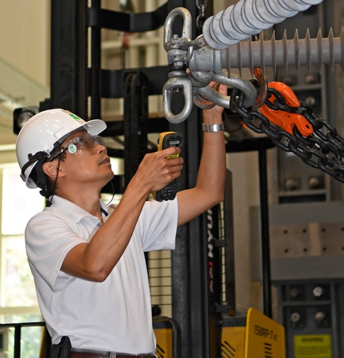EPRI researchers in the EPIC High Bay Lab adjusting the base adaptor for the composite insulator.