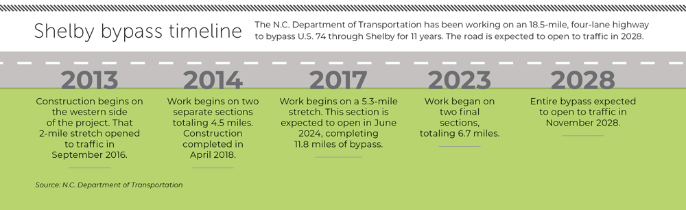 The Shelby native and retired architect was elected mayor in 2011. Less than two years later, in 2013, Ohio-based contractor E.S. Wagner began construction on the 18.5-mile Shelby Bypass, meant to alleviate traffic on the road, which is known as Dixon Boulevard inside the city limits and U.S. 74 to those passing through.
